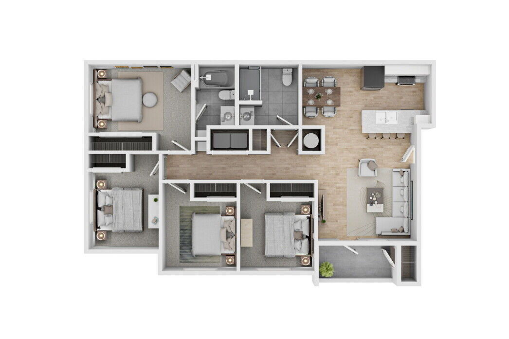 The Deschutes is our largest floor plan, offering four bedrooms and two full baths for households who need both space and privacy. This home features expansive common areas, a modern kitchen with dishwasher, and in-home laundry hookups. Perfect for growing families or multi-roommate households, The Deschutes makes Redmond apartment living feel like home.